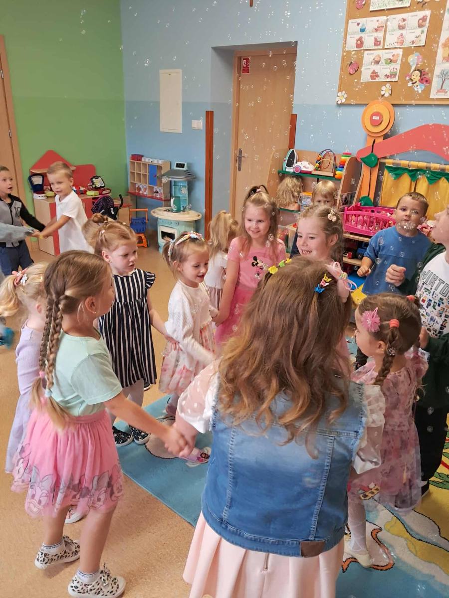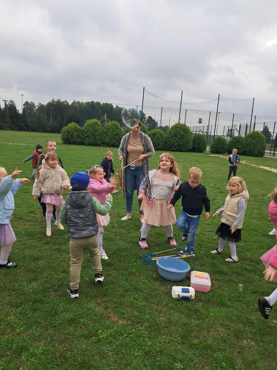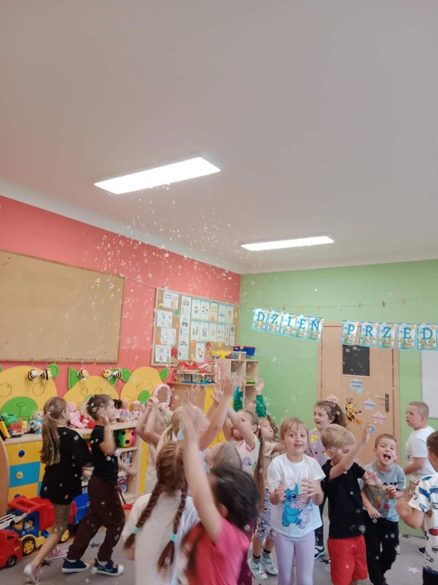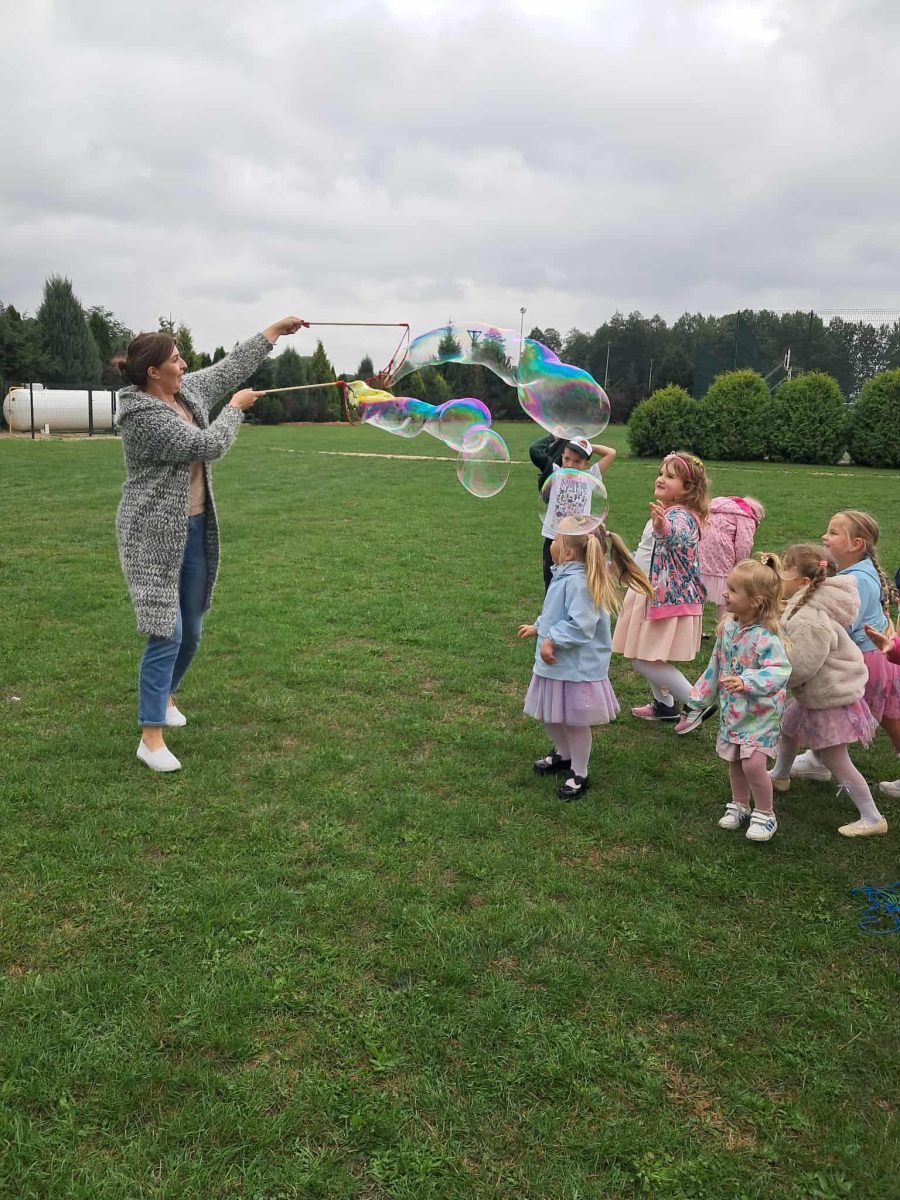 19 września 2025 roku w naszym przedszkolu w Starej Róży obchodziliśmy Dzień Przedszkolaka – jedno z najbardziej radosnych świąt w roku! Od samego rana w salach panowała wyjątkowa atmosfera – dzieci przyszły uśmiechnięte i pełne energii, gotowe na wspólną zabawę. W programie nie zabrakło tańców i wesołych zabaw muzycznych, które sprawiły, że na twarzach wszystkich maluchów pojawiły się szerokie uśmiechy. Po wspólnych tańcach na dzieci czekał słodki poczęstunek. Kulminacyjnym punktem dnia była zabawa z bańkami mydlanymi – wielkie, kolorowe bańki unosiły się nad placem szkolnym, a dzieci z radością próbowały je łapać i tworzyć własne. Śmiechu i zachwytów nie było końca!