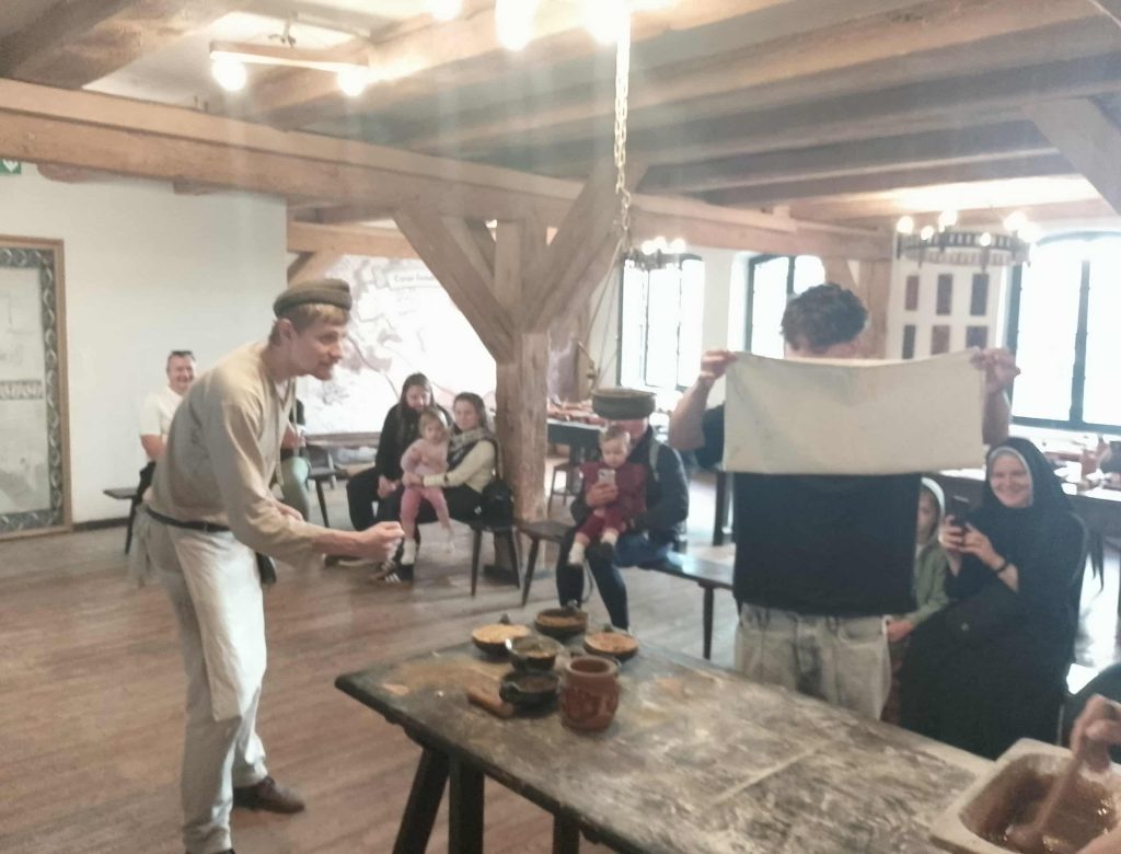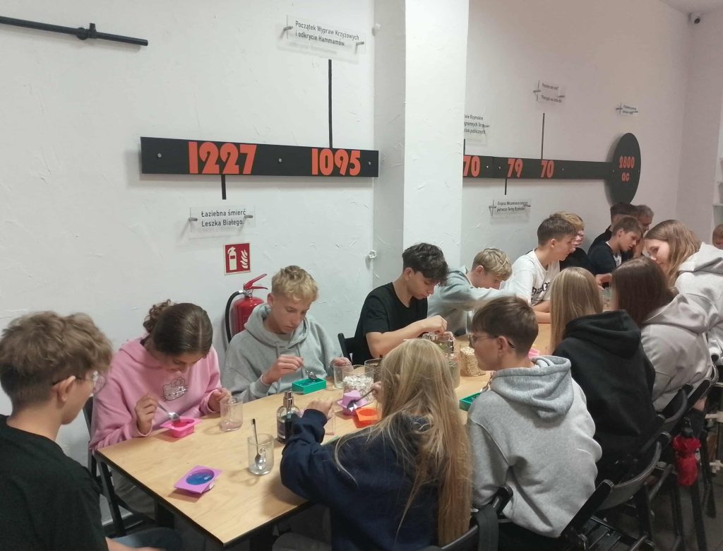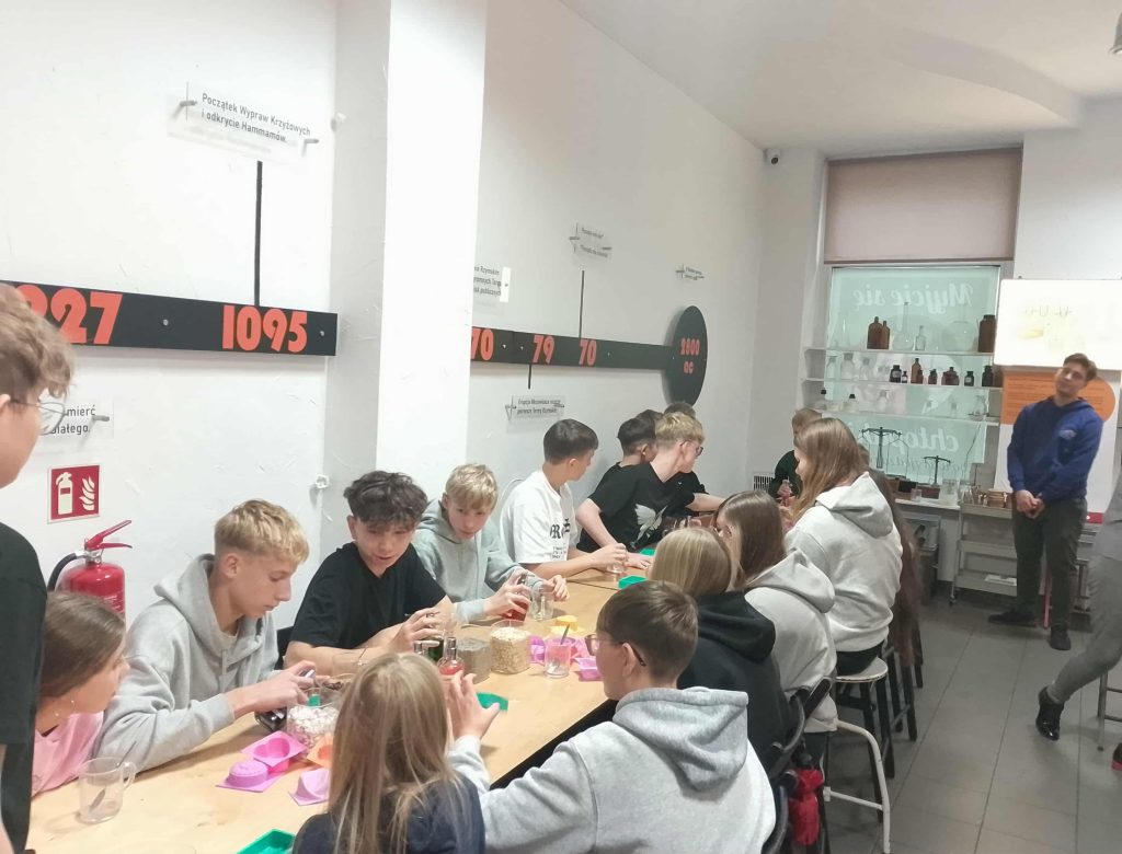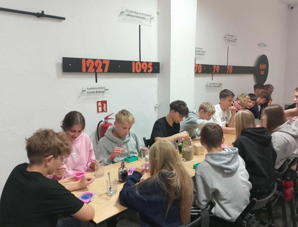 Po południu, mimo mżawki, rozpoczęliśmy zwiedzanie Bydgoszczy z przewodnikiem. Spacerowaliśmy w okolicach fontanny Potop, podziwiając piękne kamienice i zabytkowe mosty nad Brdą. Następnie udaliśmy się do Muzeum Mydła i Historii Brudu. Tam wzięliśmy udział w warsztatach robienia mydła, co okazało się bardzo ciekawym i pachnącym doświadczeniem!