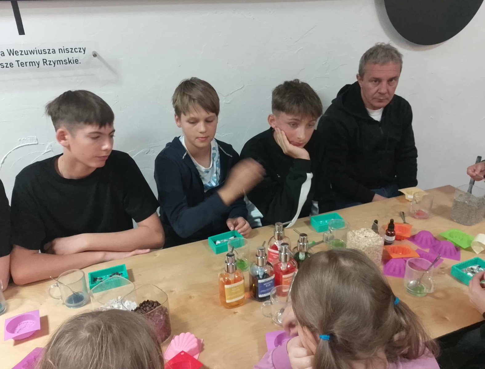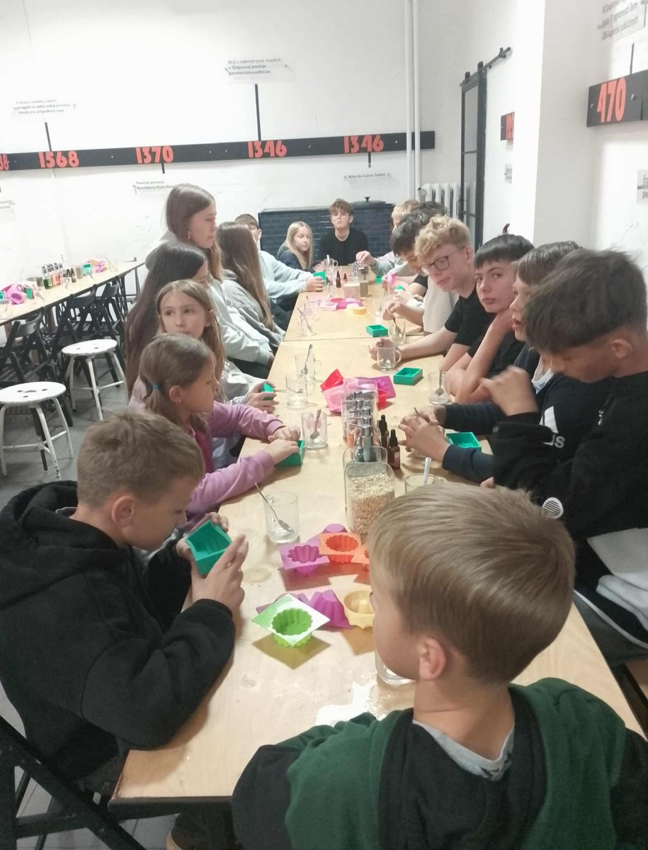 Po południu, mimo mżawki, rozpoczęliśmy zwiedzanie Bydgoszczy z przewodnikiem. Spacerowaliśmy w okolicach fontanny Potop, podziwiając piękne kamienice i zabytkowe mosty nad Brdą. Następnie udaliśmy się do Muzeum Mydła i Historii Brudu. Tam wzięliśmy udział w warsztatach robienia mydła, co okazało się bardzo ciekawym i pachnącym doświadczeniem!